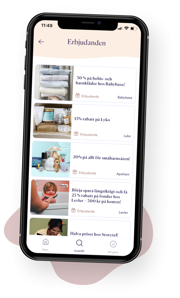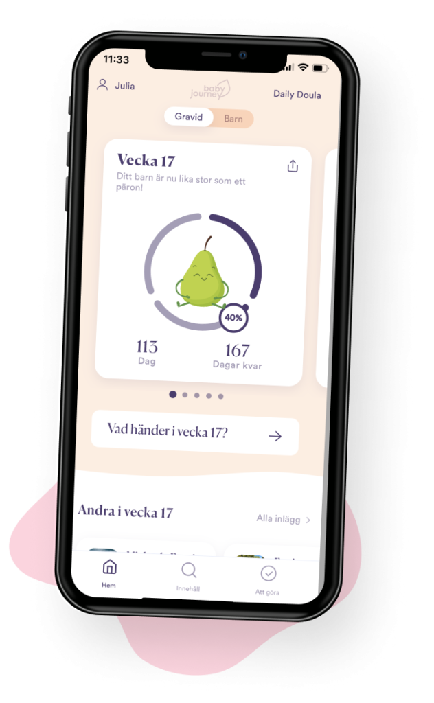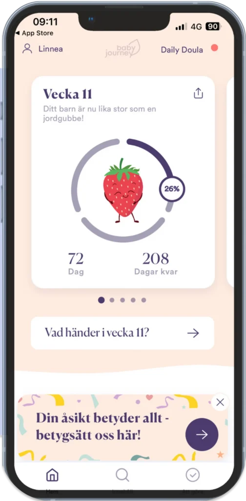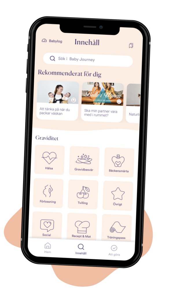 Via vår gravidapp går vi på Baby Journey med dig sida vid sida från plusset på stickan fram till förlossning och tills barnet är fem år. Med allt ifrån veckouppdateringar till checklistor och artiklar stöttar och peppar vi dig i bebisresan.